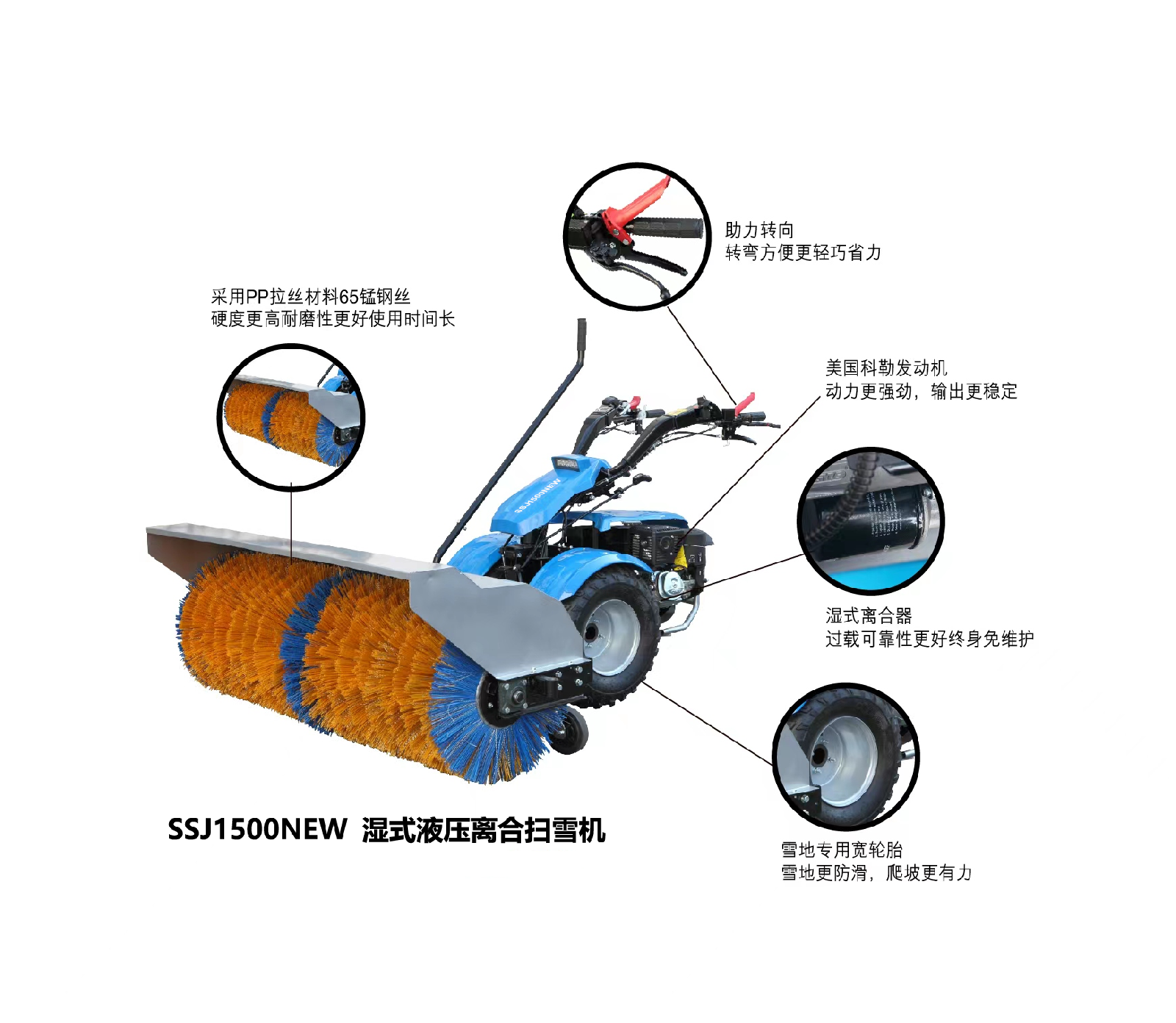 SSJ1523新款扫雪机是一款多功能步道扫雪机,完全按照国外技术的原理国内生产下线的全新产品,全液压湿式离合系统,油浴式全齿轮传动。采用15HP专用雪地动力发动机,高级耐磨聚混合滚刷,扫雪动力强劲, 使用寿命超长,地面积雪清扫效果非常干净。该机和其它扫雪机不同的是国内率先液压系统的应用,一改以往皮带传动带来的损耗,让您更安心于机器的稳定性。同时多功能快接转换的应用,快速更换不同的功能部件,实现抛雪,扫雪,铲雪等功能一体化,还可根据客户方的需要随时更换更多的功能机头用于剪草,扫地,犁地等工作,是款功能多样化,使用方便化,价格大众化的新品。主要的是该机型目前配置了破冰机头,可以针对压实的积雪和冰层进行破除清扫。该型扫雪机配备超大防滑轮胎,适合平地及山地坡道上行走,配有转向设置,可原地轻易的转弯,适用于人行步道这种非机动车道的清扫及清雪。前刷部分可左右调角度且高低可调,同时可根据操作人员的身高调节操作盘的高低。该机同时配有电启动和手动两种启动方式,即使天气寒冷也容易点火,寒冷不是问题。该机型的优势在于: